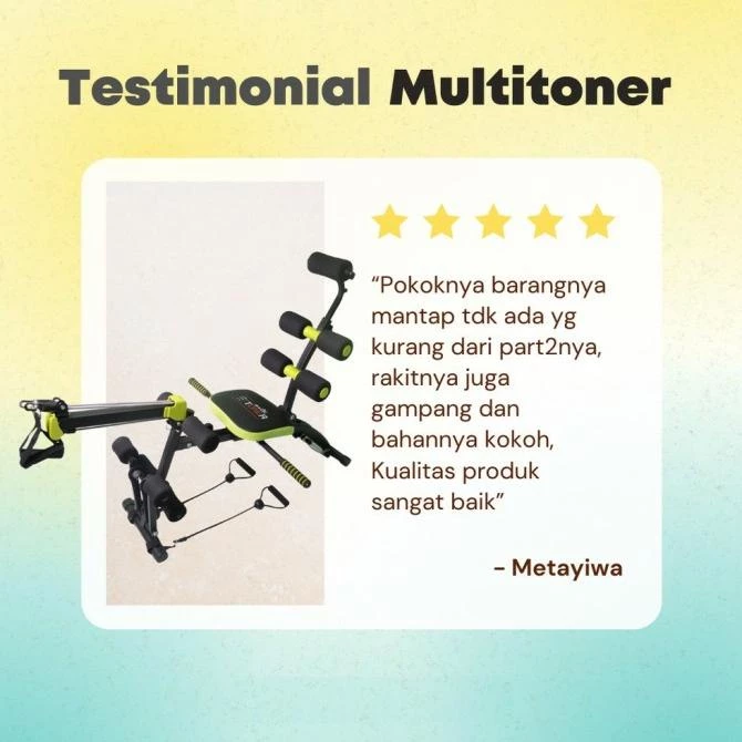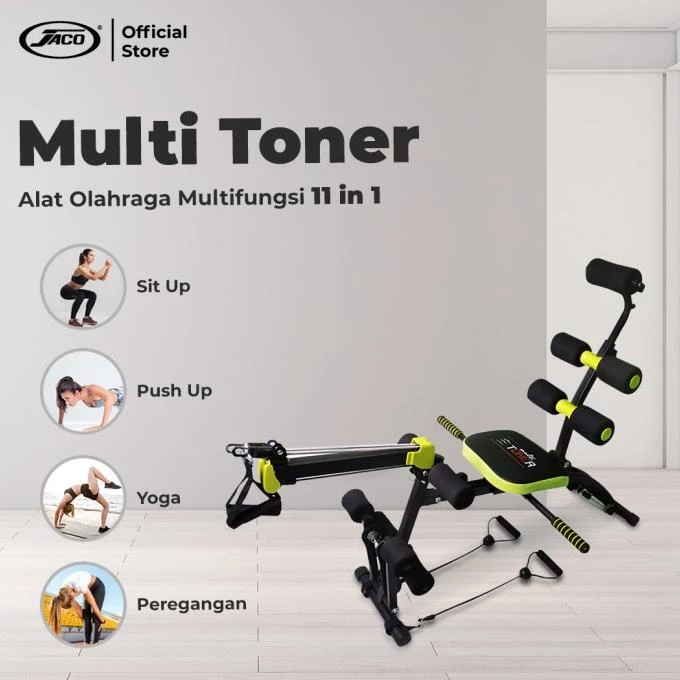 Malas berolahraga karena tidak memiliki banyak waktu luang? Dengan Multi Toner, kegiatan olahraga Anda menjadi lebih praktis. Anda bisa melakukan berbagai macam latihan dalam satu alat olahraga. Multi toner merupakan alat fitnes multifungsi yang praktis dan ekonomis!